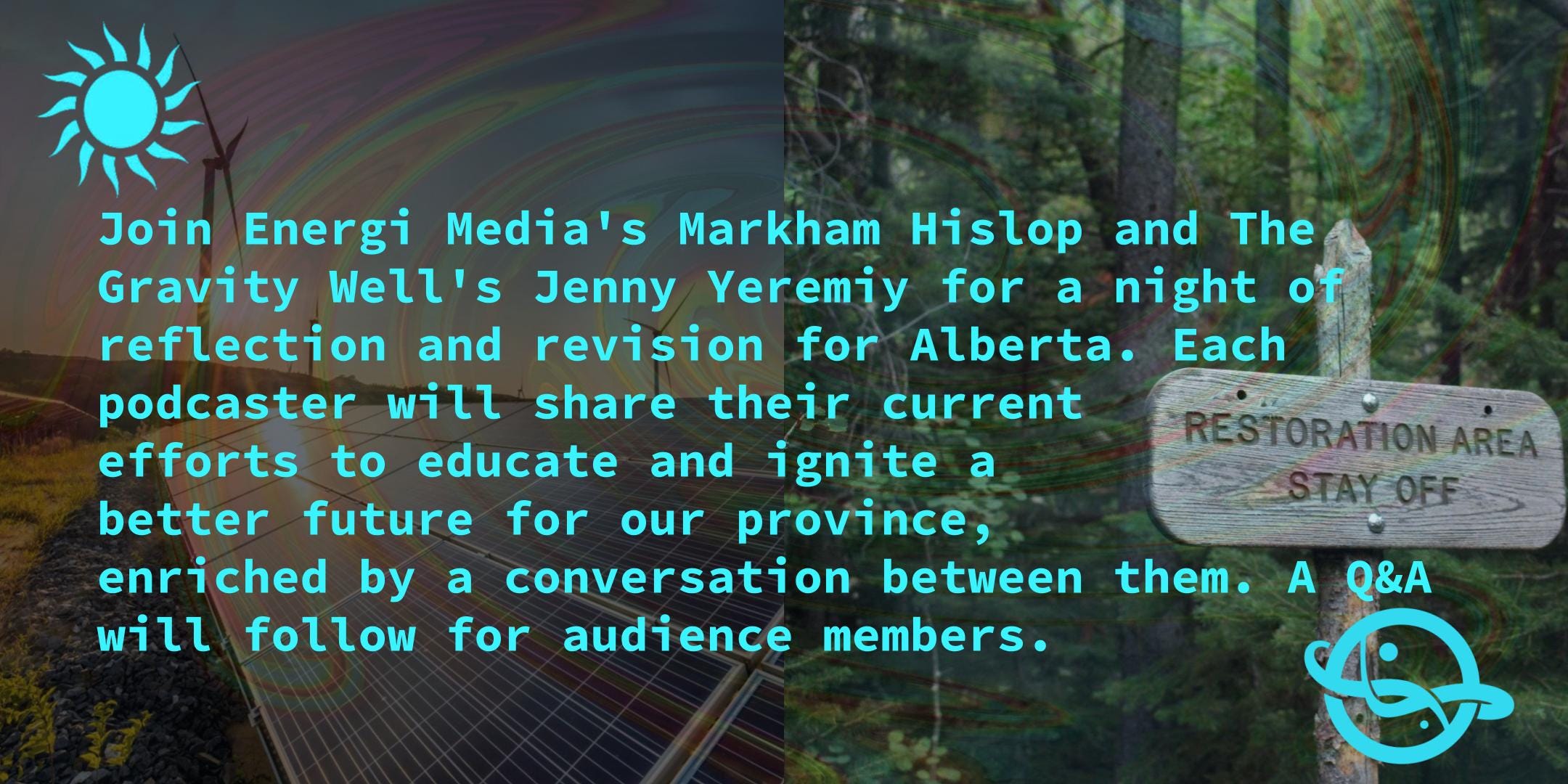 On April 24, 2026, Markham Hislop of Thoughtful Energy Journalism and Energi.Media joins me, Jenny Yeremiy of The Gravity Well podcast, at the Montgomery Community Association from 6:00 pm - 8:00 pm. Join us for a night of reflection and revision for Alberta based on our research and conversations with experts, advocates, and professionals. Each podcaster will share our current efforts to educate and ignite a better future for our province, enriched by a conversation between us. A Q&A will follow for audience members.