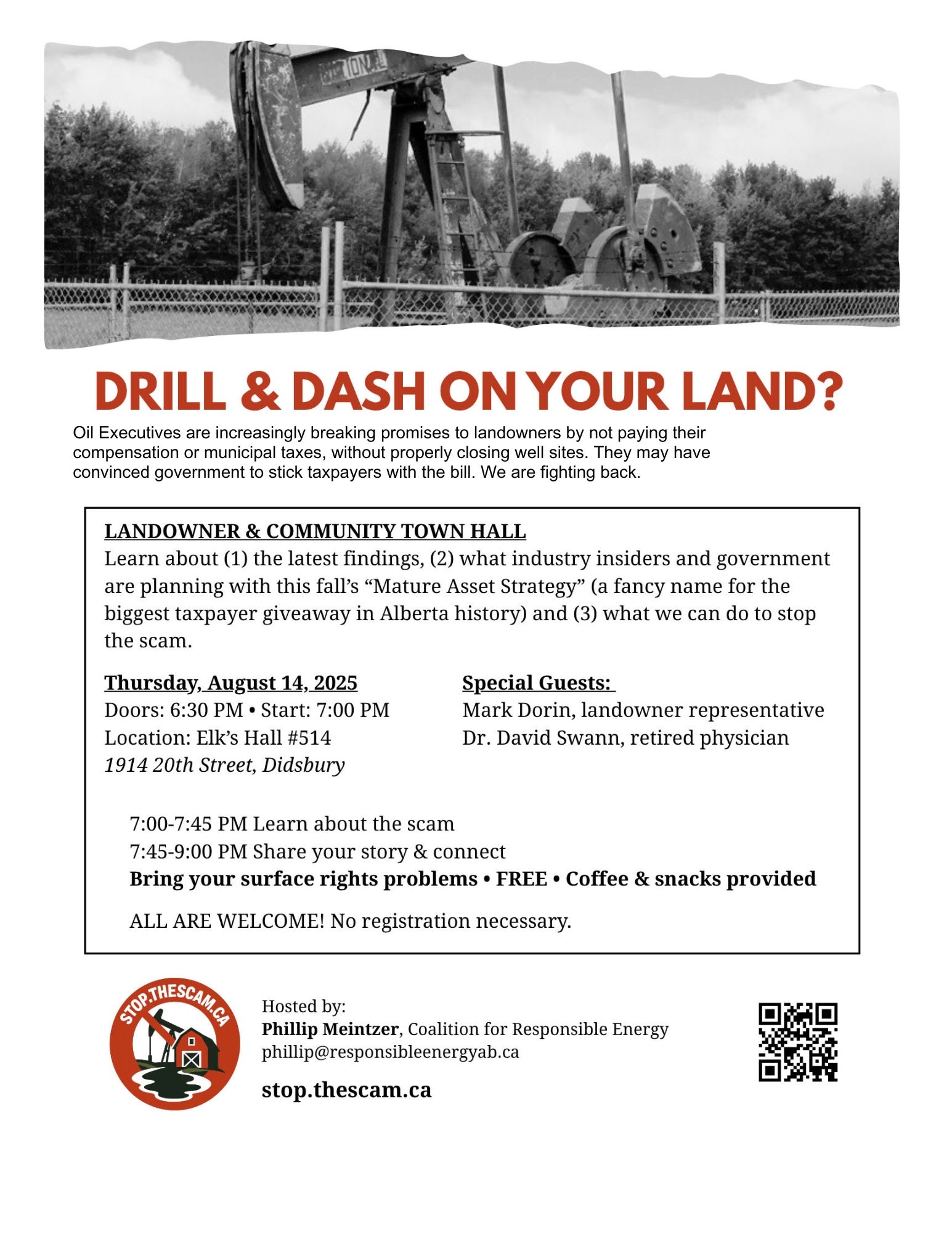 Please join us for a Landowner and Community Town Hall in Didsbury. Hosted by Phillip Meintzer with the Coalition for Responsible Energy, on Thursday, August 14 from 6:30 to 9:00 pm at Elk’s Hall in Didbury, Alberta. Learn what is happening now…how their shell game works, what industry insiders and the government are planning with this fall’s Mature Asset Strategy, and what we will do to stop them.