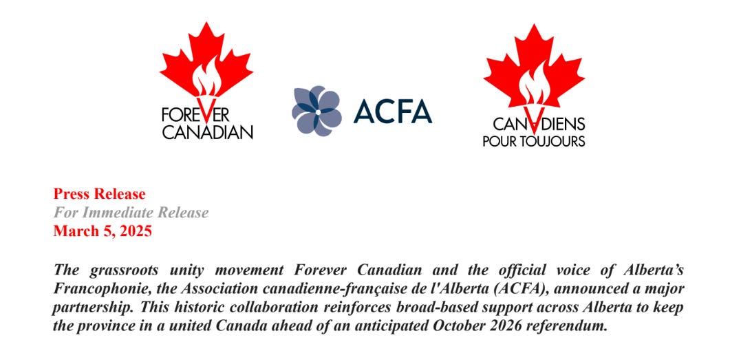 Phase two of Forever Canadian is about to be start with a new partner the Association canadienne-française de l’Alberta (ACFA). Thomas Lucaszuk and the Forever-Canadian.ca campaign team are now focused on activating, educating, and ultimately voting down Smith’s nine referendum questions. I am supporting the leader of the Calgary effort, Janel’s been an organizing mentor to me. Sign up for their newsletter to get involved!