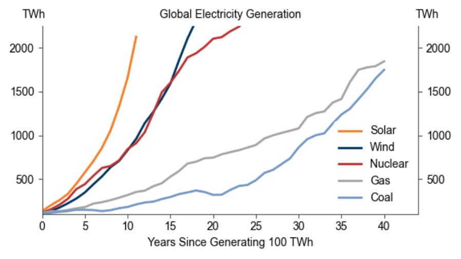 Ember, Goldman Sachs Global Investment Research shows us that solar electricity generation growth is accelerating while natural gas power is losing significant momentum.